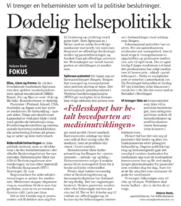 På kort tid har det vist seg at pasienter blir bedre og øker sin funksjonsevne etter påbegynt behandling. Dagens politikkvegring og hemmelighold gjør det umulig å vurdere kostnaden for medisinen opp mot de kostnadene kommunene har og får ved stadig tyngre pleiekostnader for pasienter som svekkes dag for dag, fram for at de får utnyttet sine ressurser til gode for samfunnet.