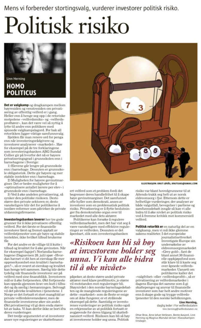 Politikerne kan forsøke å regulere velferdsmarkedet, men det har vist seg å være vanskeligere med effektive reguleringer av velferden. Dessuten er det åpenbart, slik som investeringsbanken påpeker, at desto større andel private aktører med klare profittmotiv, jo større vil motstanden mot reguleringer bli. Støynivået i den norske barnehagedebatten og de manglende reguleringene av dette «markedet» som de fleste er enige om at ikke fungerer, er et strålende eksempel på dette. Samtidig er investorenes vurderinger av politisk risiko også en erkjennelse av at politikk fortsatt er avgjørende for deres tilgang til skattefinansiert velferd. Risikoen kan bli så høy at investorene holder seg unna. Politisk risiko var blant hovedgrunnene til at Attendo trakk seg helt ut av norsk eldreomsorg i fjor. Ettersom dette er helhetlige vurderinger, der analyser av både valgutfall, bevegelser i partiene og samfunnsdebatt inngår så kan vi alle bidra til å øke nivået av politisk risiko ved å fremme kritikk mot kommersiell velferd.