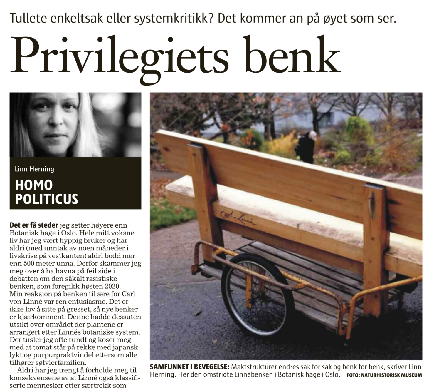 Som mange andre tok jeg meg ikke bryet med å sette meg inn i saken, men lot meg rive med av at de forslagene og argumentene jeg plukket opp, var svake. Å flytte benken ut av bydelen eller inn i hagens museum, er en dårlig løsning, fordi hele poenget er at den står til slik at man kan observere Linnés systematiske botanikk. Jeg ble heller ikke overbevist av argumentet om at benken skaper en utrygg stemning eller er rasistisk i seg selv.
