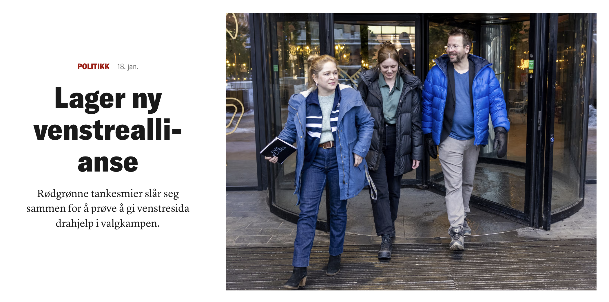 Flott oppslag om møterekka og samarbeidet mellom Tankesmien Agenda, Manifest Analyse og For velferdsstaten i Klassekampen lørdag 18. januar.