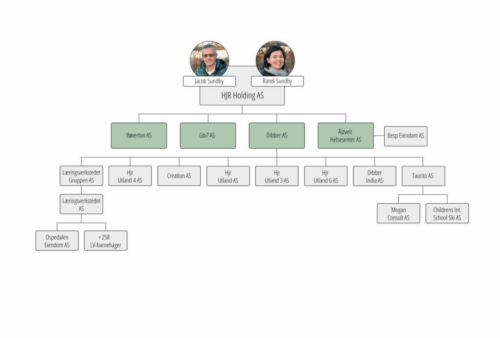 Læringsverkstedet, som i dag er landets største private barnehagekjede, eies av det norske ekteparet Hans Jacob og Randi Sundby. De har siden oppstarten i 2003 bygget opp et konsern med virksomhet i flere land. Konsernet var i 2023 den nest største velferdsprofitøren i Norge målt etter omsetningen på over 7.4 milliarder kroner. Alle barnehagene i kjeden er eid av Læringsverkstedet AS, som igjen er eid av Læringsverkstedet Gruppen AS. Læringsverkstedet Gruppen AS eies av Dibber AS, som i sin tur er eid av HJR Holding AS (se selskapskart). Alle ledd er kontrollert av eierekteparet Sundby.