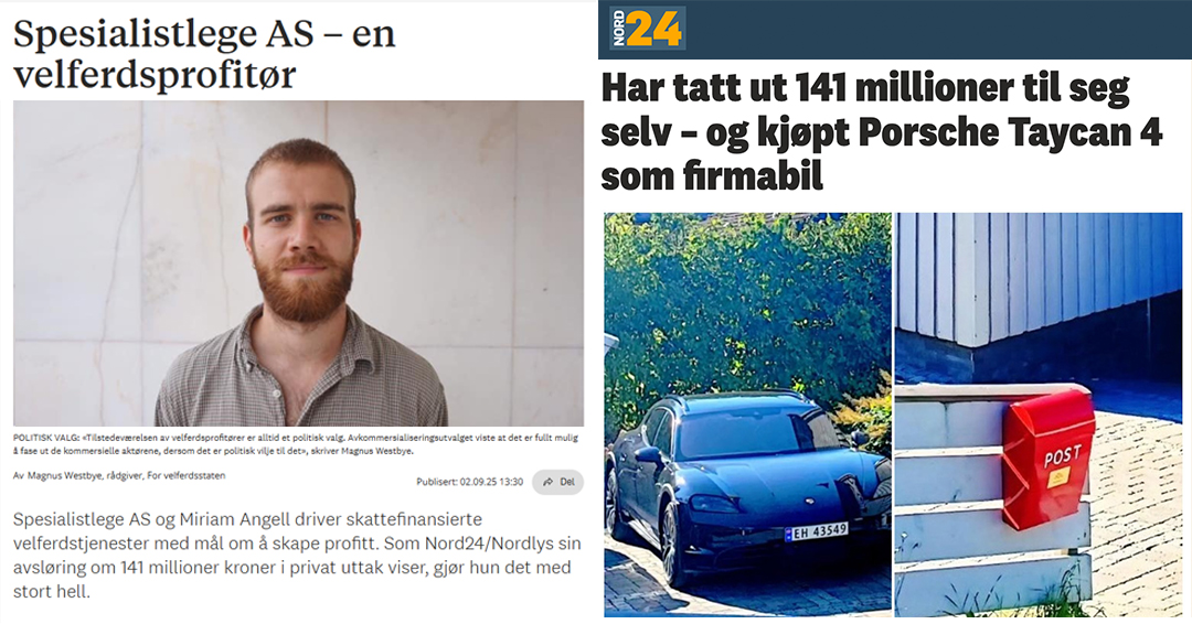 Spesialistlege AS og Miriam Angell driver skattefinansierte velferdstjenester med mål om å skape profitt. Som Nord24/Nordlys sin avsløring om 141 millioner kroner i privat uttak viser, gjør hun det med stort hell.
