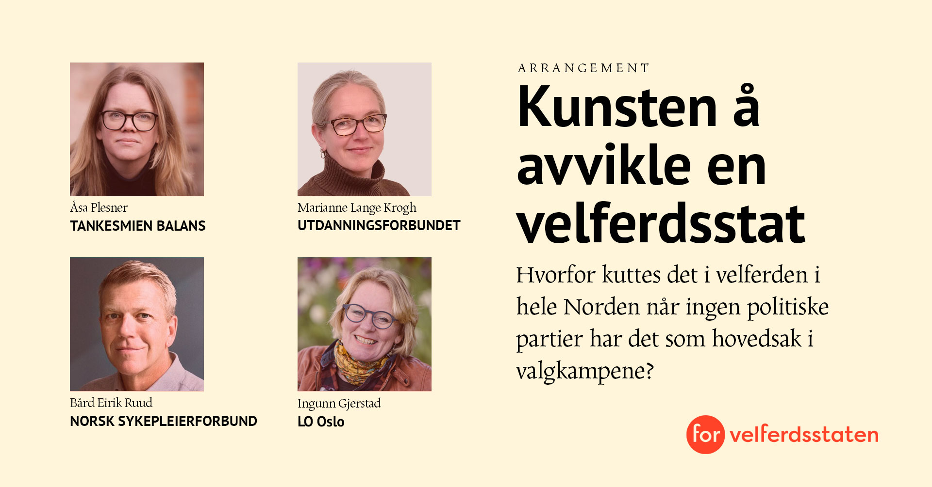 Og vi stiller spørsmålet: hva med Norge? Velferden er under kraftig press, ofte under dekke av budskap om effektivisering og avbyråkratisering. Etter Plesners innledning får vi en kommentar med et norsk perspektiv fra Bent Sofus Tranøy, professor ved Høyskolen Kristiania og Universitetet i Innlandet (INN). Møtet avsluttes med et panel bestående av Bård Eirik Ruud, fylkesleder Norsk Sykepleierforbund Oslo, Marianne Lange Krogh, fylkesleder Utdanningsforbundet Oslo, og Ingunn Gjerstad, leder av LO i Oslo.